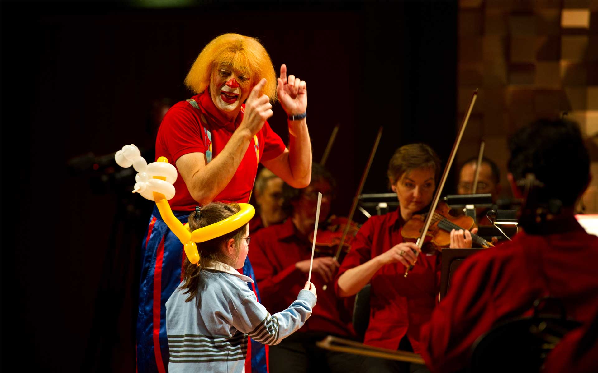 Клоун-дирижер и оркестр народных инструментов