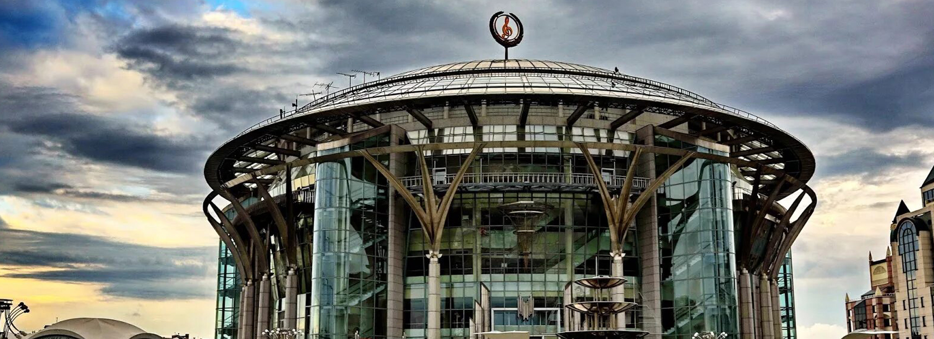 Десятиэтажное здание, построенное по европейским стандартам, объединяет классику и современность — от архитектурного решения до репертуара. Венчает купол скульптура Зураба Церетели в виде скрипичного ключа, ставшая узнаваемым символом Дома музыки.